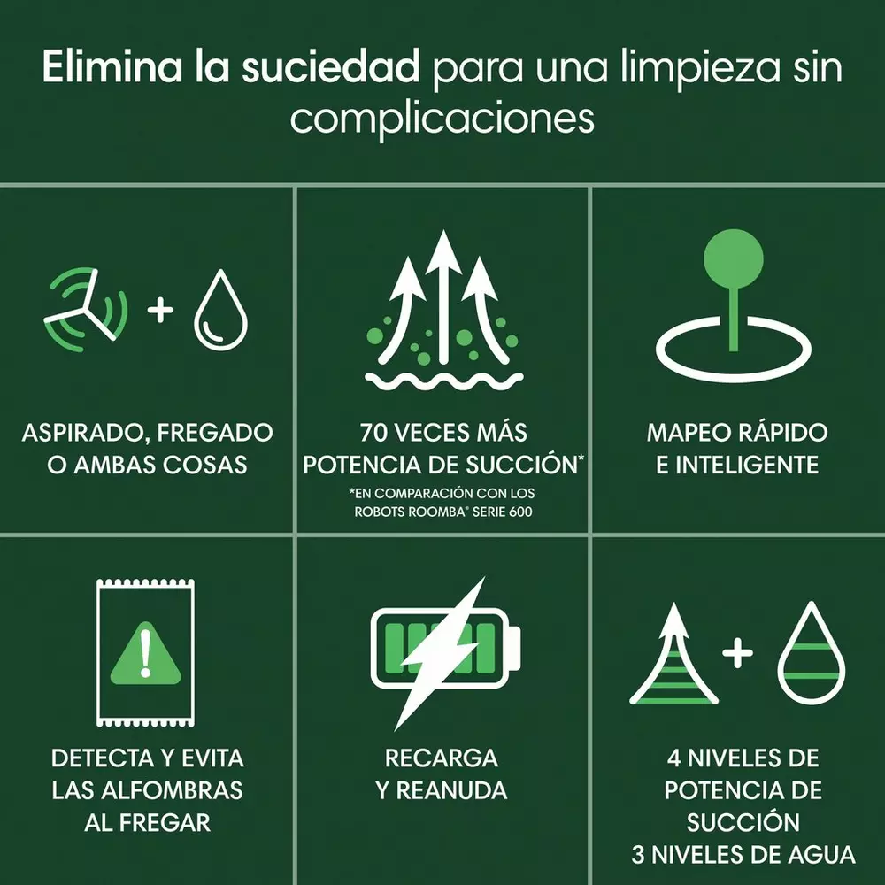 Aborda cualquier tipo de suciedad y deja la limpieza en nuestras manos. El Robot Roomba 105 Combo está diseñado para todo tipo de tareas en seco y húmedo, con una potencia de succión 70 veces superior¹, un fregado 2 veces más profundo y una mejor navegación. Tanto si trapeas, aspiras o haces ambas tareas, Roomba es tu compañero de limpieza de confianza.