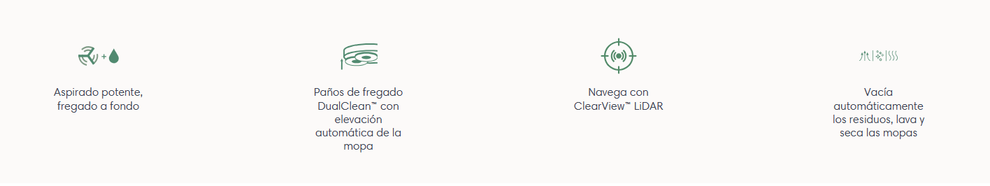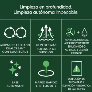 Mejora tu rutina de cuidado de suelos con las innovadoras mopas de fregado giratorias DualClean™ y una estación base de alta potencia. Este nuevo robot te ayuda a agilizar aún más las tareas de limpieza gracias al vaciado del depósito, el lavado de mopas y los ciclos de autolimpieza.